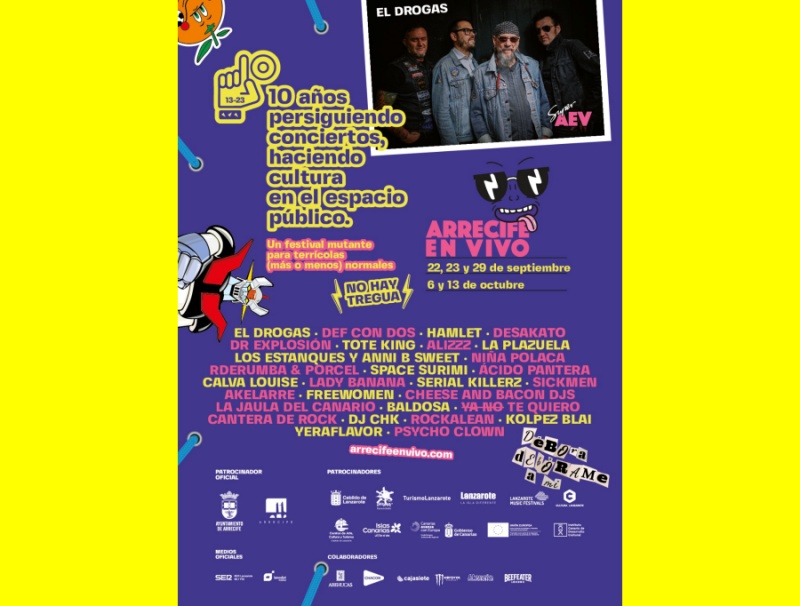 El festival Arrecife en Vivo celebra su décimo aniversario en 2023 con cuatro rutas de conciertos de entrada libre, en un circuito de 2 kilómetros peatonales en la bahía de Arrecife. Será los días 22 y 29 de septiembre, 6 y 13 de octubre, a los que se une una quinta jornada el sábado 23 de septiembre, en la bahía de Arrecife, con el Concierto Especial 10º Aniversario en el que estará El Drogas con el show Barricada 40º, Def Con Dos, Hamlet, Lady Banana, Serial Killerz y Sickmen.
