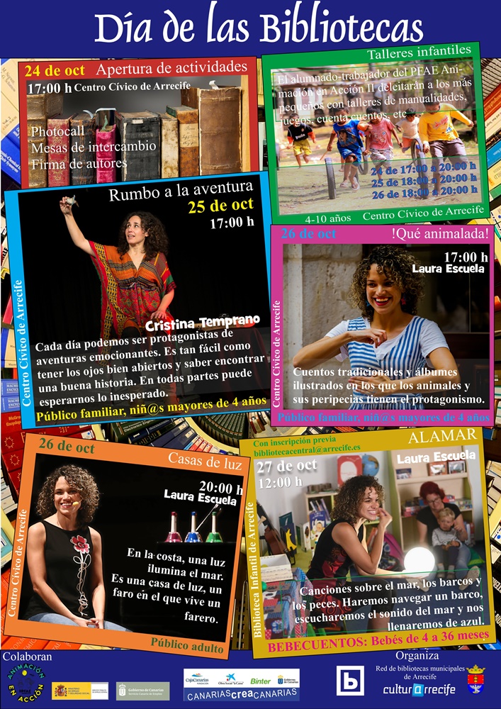 La Concejalía de Cultura de Arrecife se volcará este año en su función social de promoción de la lectura con motivo del Día de las Bibliotecas, con mesas de intercambio, firma de autores y talleres infantiles y cuentacuentos para bebés, niños y niñas y personas adultas entre los días 24 y 27 de octubre.