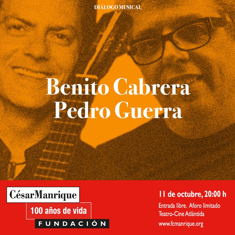 Benito Cabrera dialogará musicalmente con el cantautor Pedro Guerra el próximo viernes, 11 de octubre, a las 20.00 horas, en la sala de teatro del Cine Atlántida en Arrecife. La entrada al concierto, que tiene una duración estimada de setenta minutos, es libre hasta completar aforo. Esta actividad se enmarca dentro de la programación del centenario del nacimiento del artista que la Fundación César Manrique (FCM) celebrará hasta el 24 de abril de 2020.