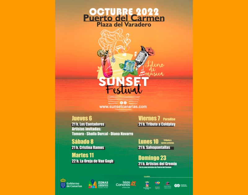 Esta noche arranca el SunSet Festival Lleno de Música con las actuaciones en la Plaza del Varadero, a partir de las 21 horas, de Los Cantadores, con la colaboración de Shaila Durcal, Tamara y Diana Navarro. Esta iniciativa de dinamización comercial y turística en Puerto del Carmen continúa los días 7, 8, 10, 11 y 23 con conciertos gratuitos para todos los públicos.