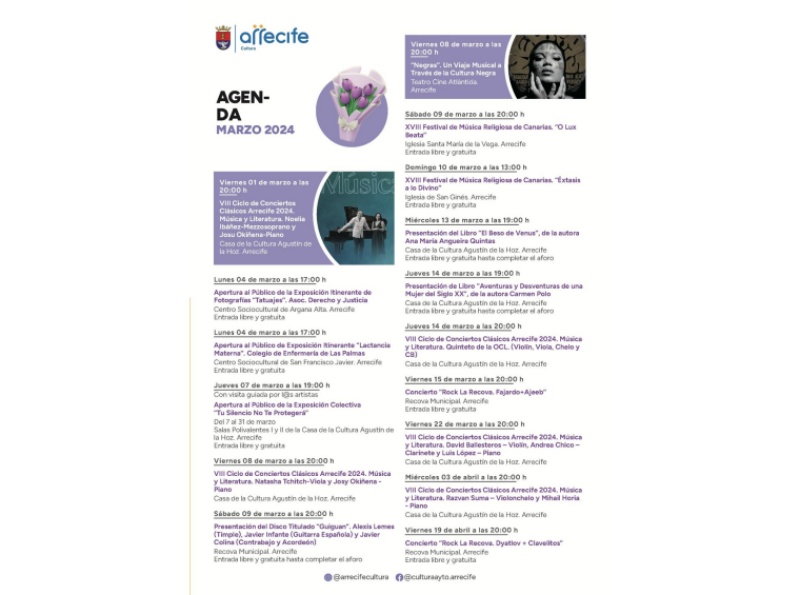 El programa de eventos culturales diseñado para el presente mes de marzo por el Ayuntamiento presidido por el alcalde Yonathan de León Machín, a través de la Concejalía de Cultura dirigida por Abigail González, incluye además música clásica, religiosa y con acento canario, conciertos de rock, exposiciones y presentaciones literarias