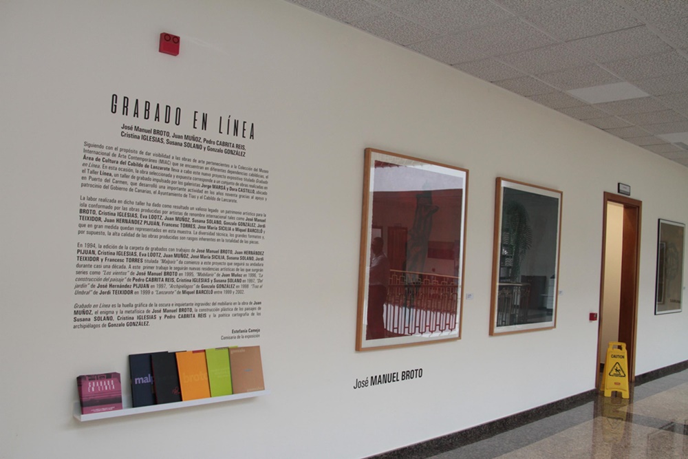 Partiendo de las piezas de los artistas Juan Muñoz, José Manuel Broto, Cristina Iglesias, Susana Solano, Pedro Cabrita Reis y Gonzalo González, que se encuentran en los fondos de la colección y que no se exhiben en el MIAC, se han seleccionado 23 grabados de dichos artistas, para configurar una exposición que hemos titulado Grabado en Línea, que tendrá como complejo reto el de estar configurada en el marco de una institución administrativa como el Cabildo Insular, donde también se encuentra la muestra Insularia. 60 años de arte en la Casa Cabildo.