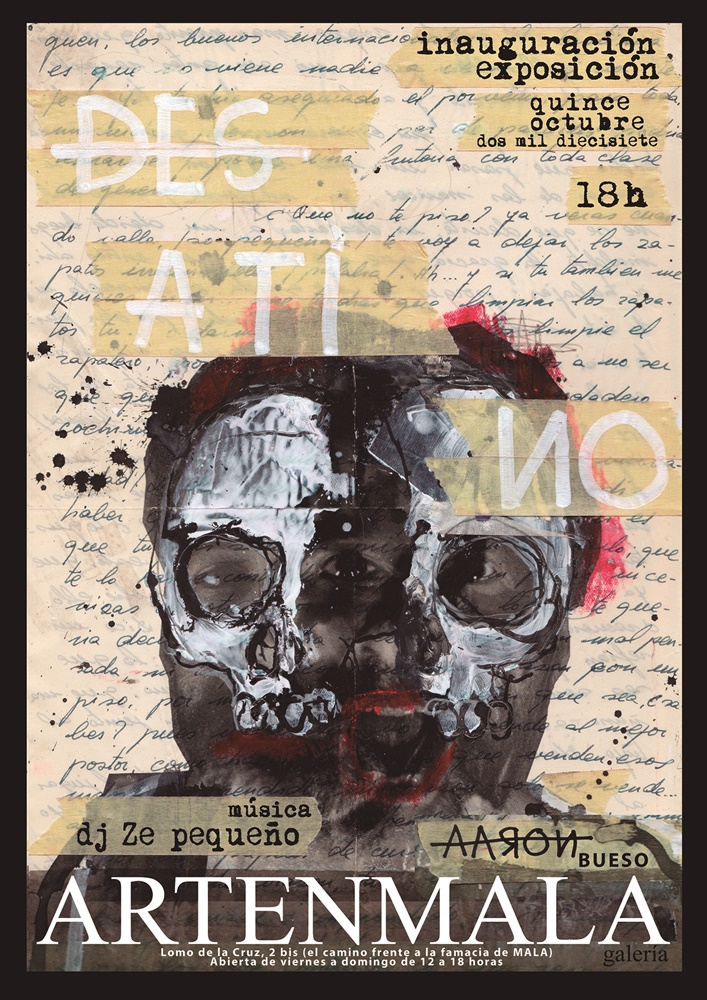 Este domingo 15 de octubre a las 18 horas, ARTENMALA inaugura una exposición individual de Aarón Bueso titulada DESATINO con sus últimas series de pinturas que abarcan diferentes temáticas como el sexo o la soledad, con técnica mixta sobre lienzo, madera y papel. Aarón Bueso posee un lenguaje ecléctico y espontáneo que no dejará indiferente al espectador.