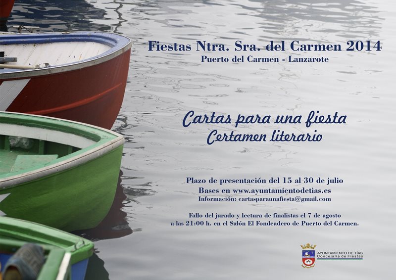 Dentro del amplio programa de actos que con motivo de las Fiestas de Nuestra Señora del Carmen se desarrollará entre el 29 de julio y el 11 de agosto de 2014 en la localidad de Puerto del Carmen,en el municipio de Tías, la Concejalía de Fiestas, bajo la dirección del concejal Francisco Javier Aparicio Betancort, contempla la continuidad del certamen literario Carta para una fiesta por la aceptación con que fue recibido el año pasado con participantes de Argentina, Chile, Perú, Francia y España.