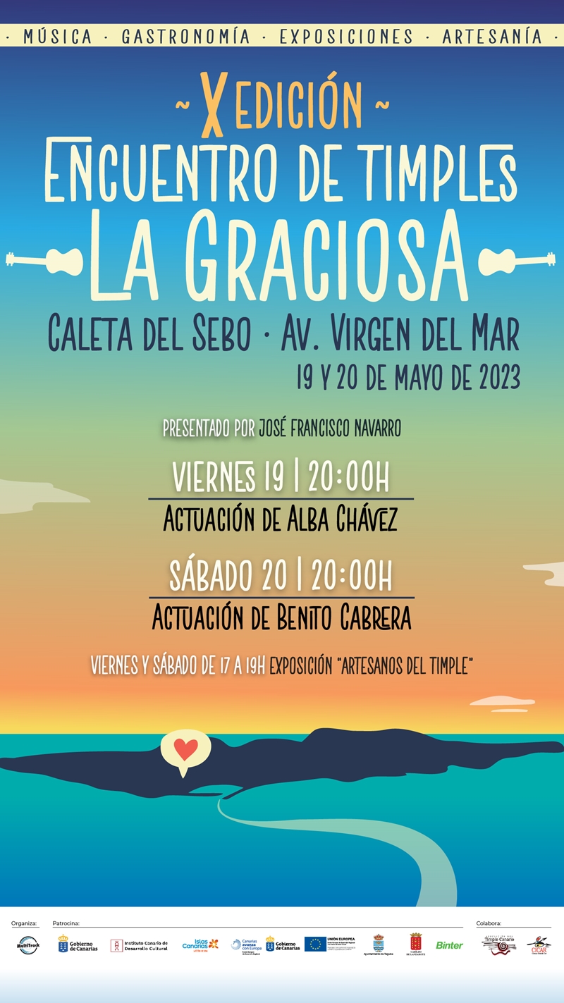 El Encuentro de Timples de La Graciosa, regresa un año más en este 2023 con una edición especial ya que celebra su décimo aniversario. Este evento, que tendrá lugar los días 19 y 20 de mayo en la plaza de la Caleta de Sebo a las 20:00h, será una oportunidad única para disfrutar de la mejor música y tradición de las islas en uno de los lugares más privilegiados de las Islas Canarias.