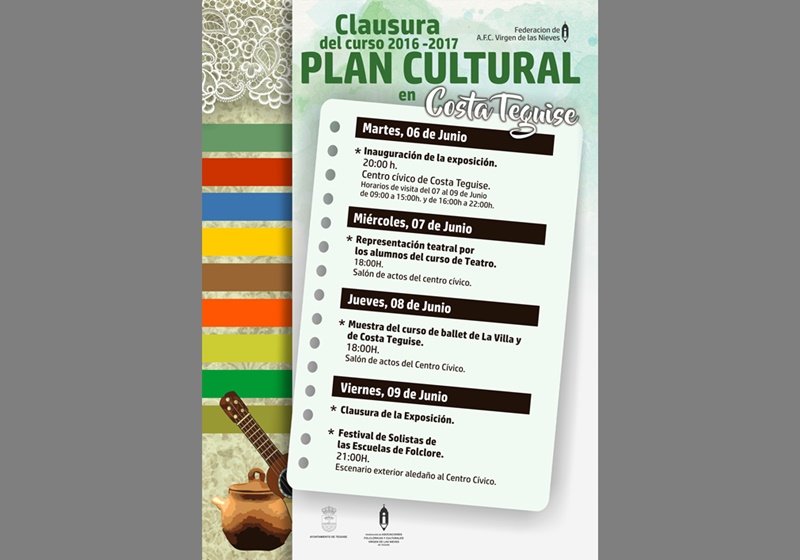 Del 6 al 9 de junio, el Ayuntamiento junto con la Federación han preparado un programa de actos que incluirá sesión teatral, muestra del curso de ballet de La Villa y Costa Teguise y el Festival de Solistas de las Escuelas de Folclore para clausurar la muestra del Plan Cultural, el viernes, a las 21 horas, en el escenario exterior aledaño al Centro Cívico de Costa Teguise.