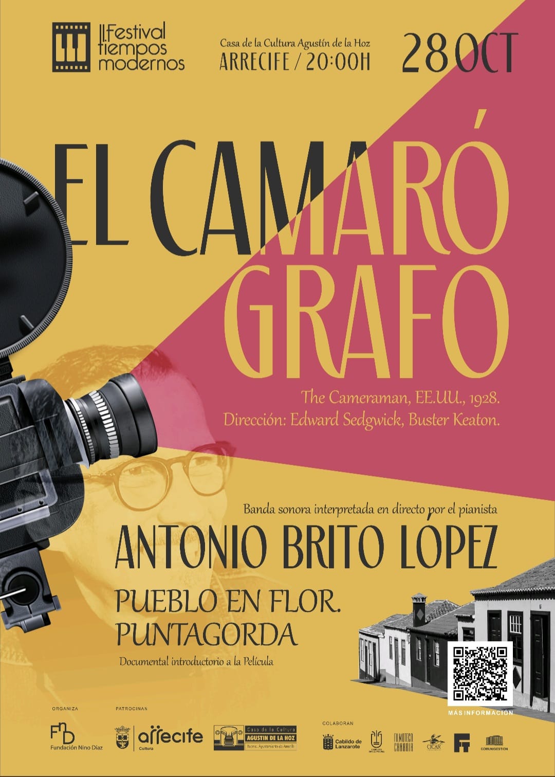 La segunda sesión del 'II Festival Tiempos Modernos', promovido por la Fundación Nino Díaz, proyecta este sábado día 28 en Arrecife la película 'El Camarógrafo', de Buster Keaton y Edward Sedgwick, con banda sonora interpretada en directo por el pianista Antonio Brito.