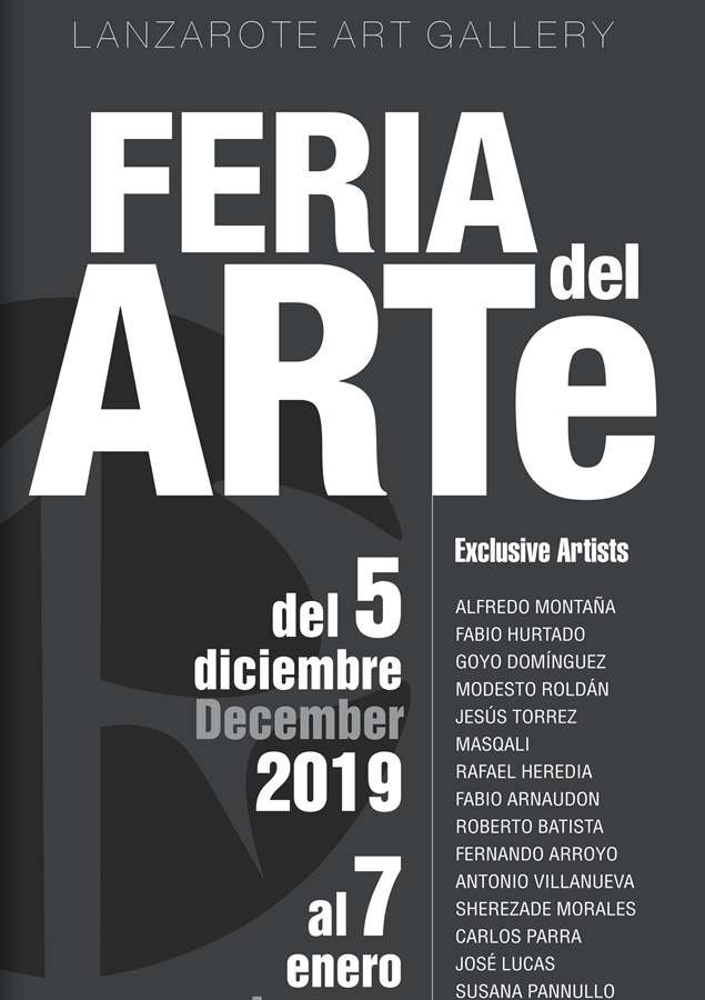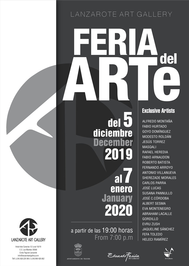 Feria del arte, única feria de arte en Lanzarote, expone sus obras en un espacio único y singular frente al mar en Plaza de las Maretas – Costa Teguise, donde coleccionistas internacionales aprovecharán sin duda las magnificas oportunidades que la galería les ofrece. La cita tendrá lugar en Costa Teguise desde el 05 diciembre hasta el 07 de enero de 2020.