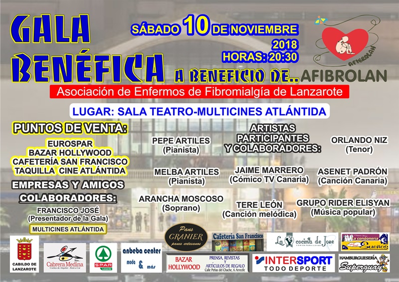 El próximo sábado 10 de noviembre a las 20:30 horas, Afibrolan, la Asociación de Enfermos de Fibromialgia de Lanzarote organiza una gala benéfica para la recaudación de fondos que irán destinados a sufragar las terapias y actividades de la asociación.