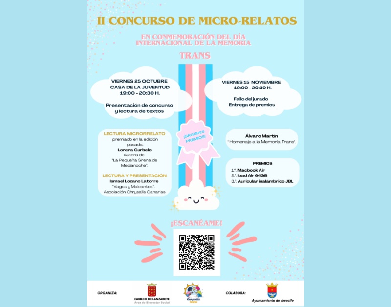El Cabildo de Lanzarote, a través del Área de Bienestar Social e Igualdad, en colaboración con la asociación Chrysallis, lanza una nueva edición del Concurso de Microrrelatos con motivo de la conmemoración del Día Internacional por la Memoria Trans, que se celebrará el 20 de noviembre. Este concurso busca promover la lucha contra la discriminación y fomentar la igualdad en la comunidad.