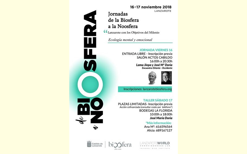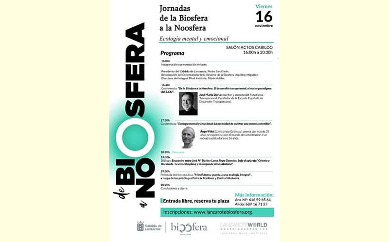 El Salón de Actos del Cabildo de Lanzarote acogerá el viernes 16 de noviembre las 'Jornadas de la Biosfera a la Noosfera. Ecología mental y emocional', organizadas por la Oficina de la Reserva de la Biosfera a través del programa 'Lanzarote con los Objetivos del Milenio' y en colaboración con el Integral Mind Institute.