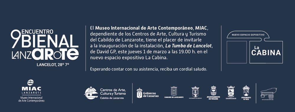 El 9º Encuentro Bienal ArteLanzarote organizado por los Centros de Arte, Cultura y Turismo, a través del Museo Internacional de Arte Contemporáneo, MIAC-Castillo de San José, sigue adelante con su programación con la inauguración de la instalación La tumba de Lancelot, que tendrá lugar a las 19.00 horas de hoy jueves, 1 de marzo, en La Cabina.