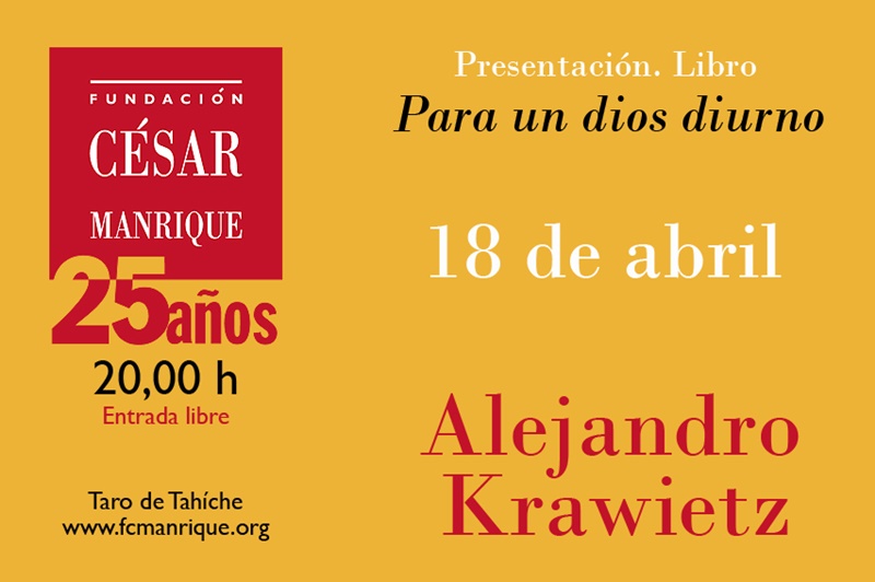 La sede de la Fundación César Manrique (Taro de Tahíche) acoge el martes 18 de abril la presentación de el libro titulado "Para un dios diurno", de Alejandro Krawietz, una recopilación de su obra poética, a la que se añade un último poemario inédito. El libro se incluye en la colección Cámara Clara que dirige Miguel Martinón, de Ediciones Idea.
