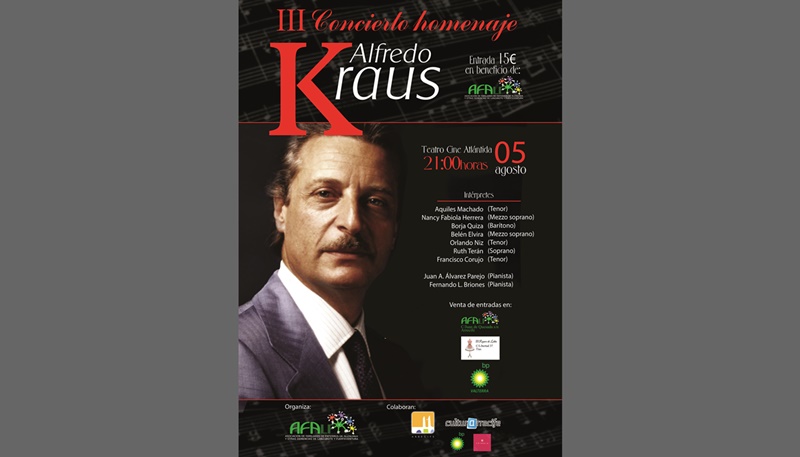 El recuerdo de Alfredo Kraus vuelve un año más a los corazones de cuantos lo conocieron y lo admiraron en un concierto solidario, que celebra este 2016 su tercera edición, y cuya recaudación se destinará a la Asociación de familiares de enfermos de Alzheimer y otras demencias, Afa Lanzarote.