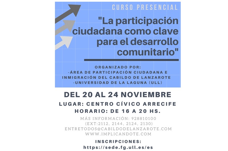 El área de Participación Ciudadana e Inmigración del Cabildo de Lanzarote, dirigida por la consejera Patricia Pérez, organiza en el marco del proyecto "Lanzarote Participa" y de forma conjunta con la Universidad de La Laguna el curso presencial 'La participación ciudadana como clave para el desarrollo comunitario', que cuenta también con la colaboración del Ayuntamiento de Arrecife. El curso consta de 20 horas de duración y se llevará a cabo entre los días 20 y 24 de noviembre en la sede del Centro Cívico de Arrecife, de 16.00 a 20.00 horas.