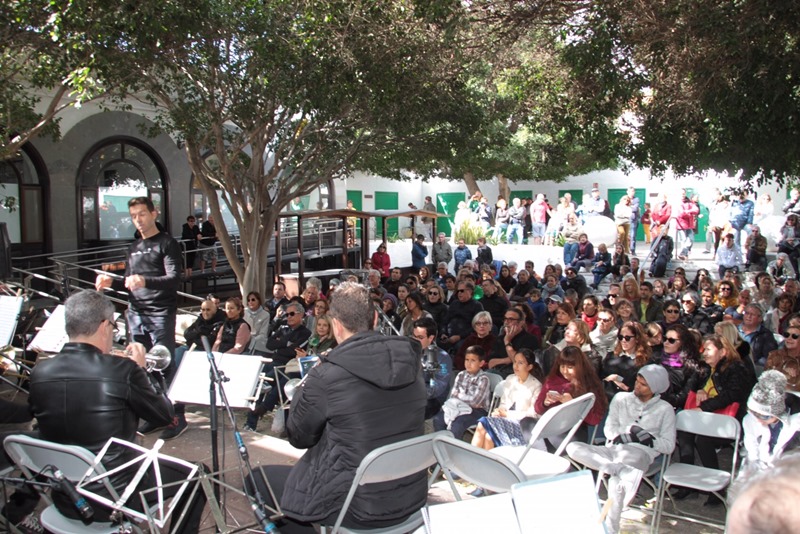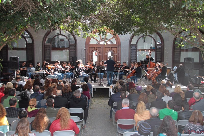 A las 12.00 horas, en una Recova municipal llena hasta la bandera, arrancó el concierto con La Orquesta de Guitarras, La Brass Band y La Orquesta de Cuerdas de la Escuela Insular de Música (CIEM).