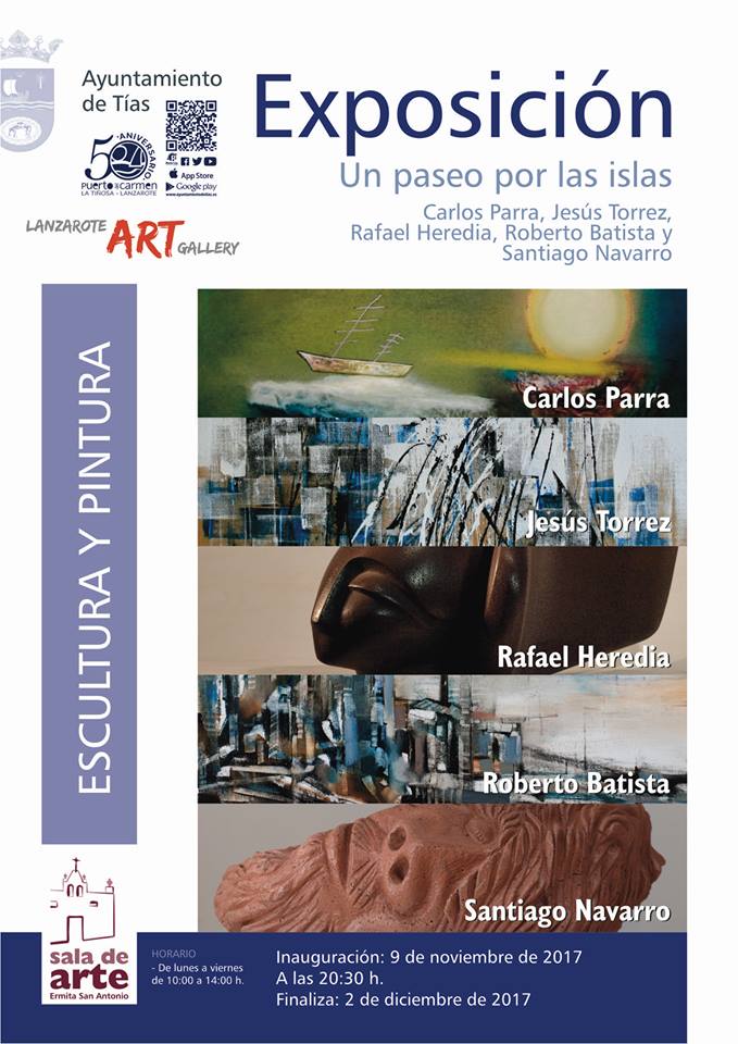 La exposición de pinturas y esculturas, con obras artísticas de Carlos Parra, Jesús Torrez, Rafael Heredia, Roberto Batista y Santiago Navarro, se inaugurará a las 20:30 horas de este jueves, día 9 de noviembre. Hasta el próximo 2 de diciembre se podrá visitar las obras que forman parte de ' Un Paseo por las Islas', una colección y muestra promovida por Lanzarote Art Gallery con la colaboración de la Concejalía de Cultura del Ayuntamiento de Tías.