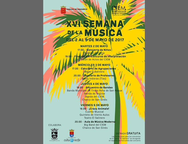 El Teatro El Salinero, el Charco de San Ginés, el Salón Indieras en Tías y el propio Salón de Actos del Centro Insular de Enseñanzas Musicales (CIEM) serán los escenarios elegidos este año para que el público asistente disfrute de la actividad concertística organizada en el marco de la decimosexta edición de la 'Semana de la Música' del Centro Insular de Enseñanzas Musicales del Cabildo de Lanzarote. Este año colaboran los ayuntamientos de Tías y Arrecife.