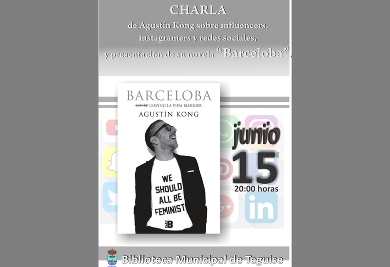 Charla de Agustín Kong sobre influencers, instagramers y redes sociales, y presentación de su novela “Barceloba”, el viernes 15 de junio, a las 20:00 horas, en la Biblioteca Municipal de Teguise. Entrada libre hasta completar aforo.