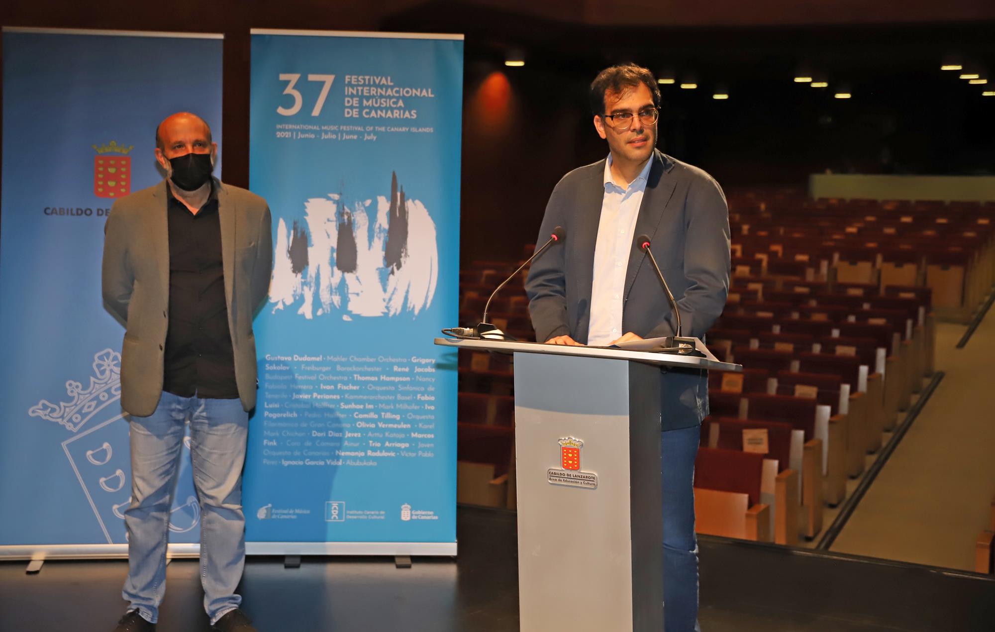 Perdigón y Alberto Aguiar, consejero de Cultura del Cabildo de Lanzarote, presentaban esta mañana los cinco recitales que podrán disfrutarse en Lanzarote y La Graciosa en una rueda de prensa celebrada en el Teatro Víctor Fernández Gopar "El Salinero", espacio que acogerá uno de los conciertos, concretamente el de la Orquesta Filarmónica de Cámara de Baviera.
