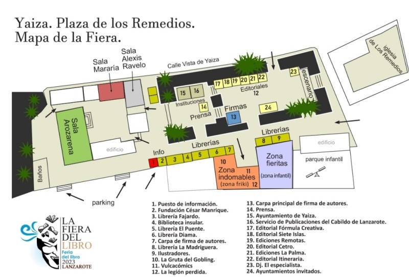 La Fiera del Libro albergará los stands institucionales de los Ayuntamientos de Yaiza, Teguise y Tinajo, el Servicio de Publicaciones del Cabildo de Lanzarote y la Biblioteca Insular; de las librerías El Puente, Fajardo, Diama y La Madriguera, y de las editoriales Formula Creativa, 7 Islas, Ediciones Remotas, Itineraria, Cetro y La Palma. También contará con carpa expositiva y de venta la Fundación Cesar Manrique y habrá espacios específicos de información de la feria, para firmas y de trabajo, para medios de comunicación.