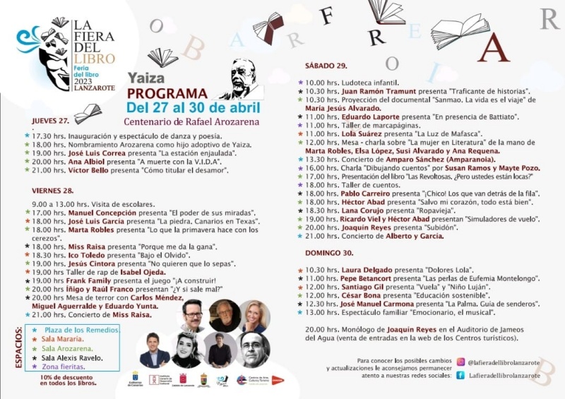 Después de cuatro años sin su cita con el público lector de Lanzarote, vuelve al calendario cultural la Feria del Libro, que en esta ocasión homenajea al escritor tinerfeño Rafael Arozarena en el primer centenario de su nacimiento y el medio siglo de la publicación de su obra cumbre, Mararía. Por abundar en el reconocimiento, la plaza de Los Remedios y la Casa de la Cultura “Benito Pérez Armas”, en Yaiza, han sido los escenarios elegidos para su celebración.