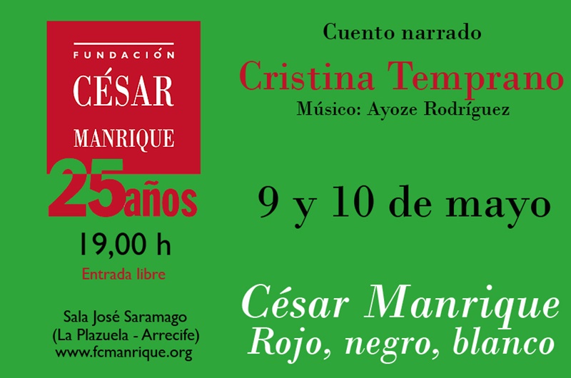 El próximo martes, 9 de mayo, y el miércoles, 10 de mayo, a las 19 horas, en la Sala José Saramago de la Fundación César Manrique (La Plazuela, Arrecife), tendrán lugar dos representaciones del cuento “César Manrique. Rojo, negro, blanco”, abiertas al público familiar (está recomendado para niños y niñas mayores de 7 años) hasta completar aforo. Se trata de un espectáculo de narración con música de piano y clarinete, creado e interpretado por la narradora de historias Cristina Temprano, en cuya puesta en escena participa Ayoze Rodríguez, creador e intérprete de la música.