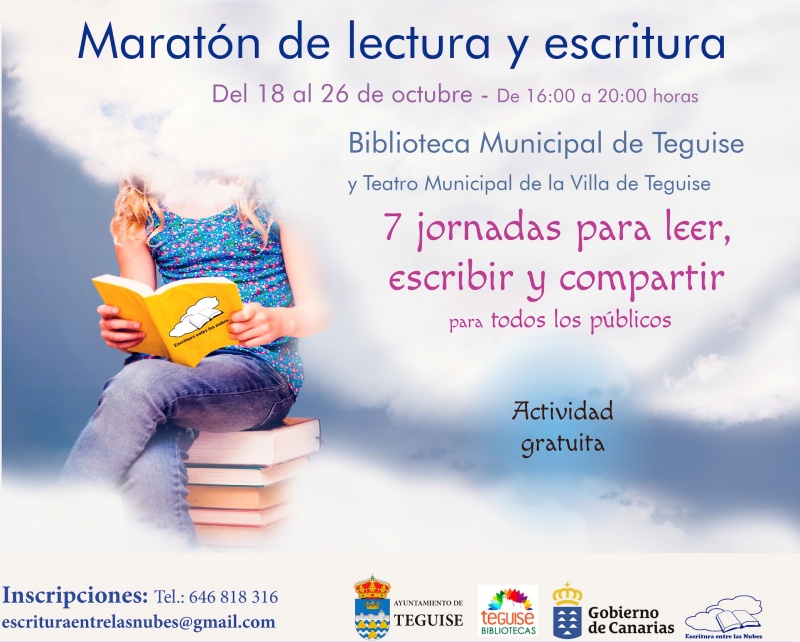 El Ayuntamiento de Teguise, desde su concejalía de Bibliotecas, que dirige Sara Bermúdez Aparicio, y la editorial canaria Escritura entre las Nubes, con el apoyo del Gobierno de Canarias, ofrecen un «Maratón de lectura y escritura» para todos los públicos con motivo de la celebración de la Semana de la Bibliotecas.