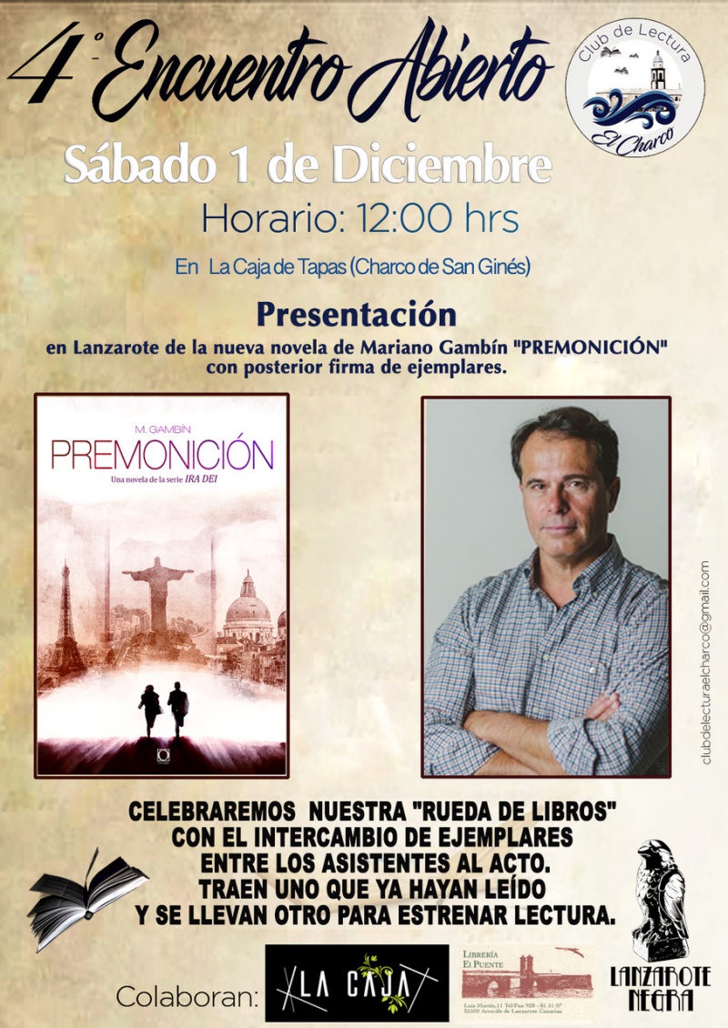 El Club de Lectura El Charco celebrará el próximo sábado 1 de diciembre su Cuarto Encuentro Abierto para amantes de la lectura, de todas las edades, con el principal atractivo de la presentación en primicia en Lanzarote de "Premonición", la nueva y esperadísima novela del creador de la exitosa serie de novelas de misterio IRA DEI, el tinerfeño Mariano Gambín, protagonista de la primera actividad organizada por el club de lectura el pasado mes de marzo y que supuso la presentación en la isla de su hasta ahora última novela "La mansión", uno de los libros de ficción, según datos oficiales, más vendidos en Canarias.