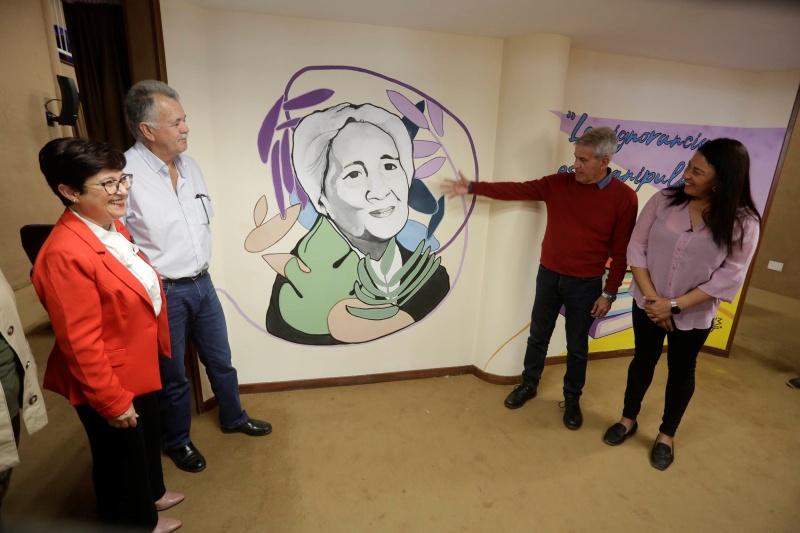 La obra, realizada por la joven artista conejera Judith Morales, se ubica en el Salón de Actos, lugar que desde ahora también llevará el nombre de la maestra homenajeada