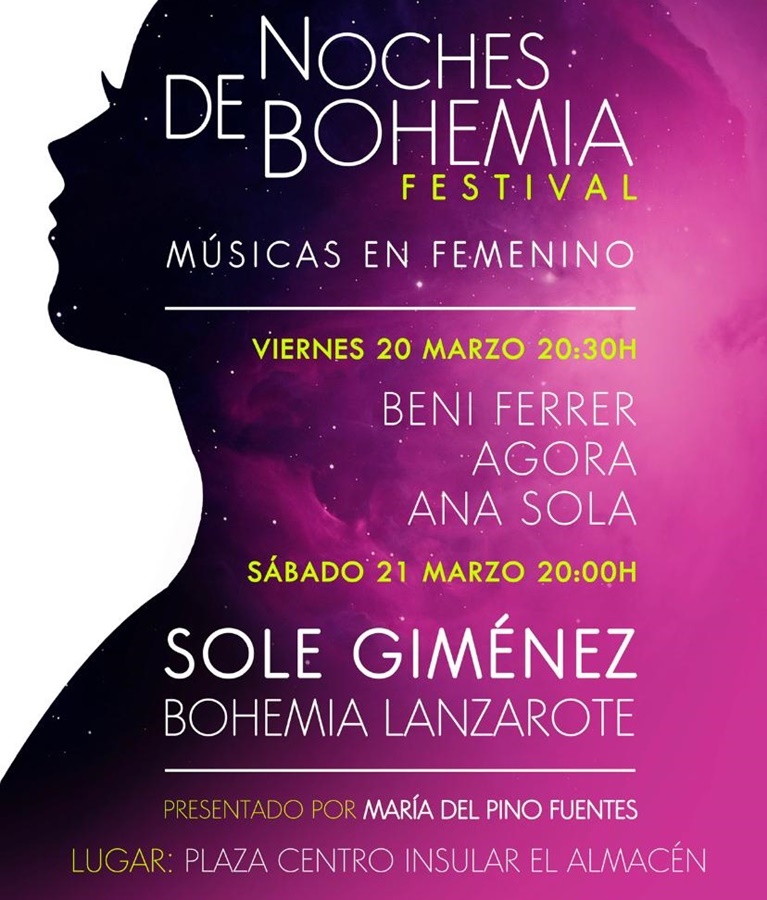 La Plaza de El Almacén de Arrecife acogerá los próximos 20 y 21 de marzo el Festival Noches de Bohemia– Músicas en femenino con la actuación especial de la reconocida vocalista y compositora Sole Giménez. Esta reconocida artista presentará en Lanzarote su nuevo proyecto: “Mujeres de música”, en el marco de un festival dedicado a la figura de la mujer y con un cartel formado, mayoritariamente, por mujeres
