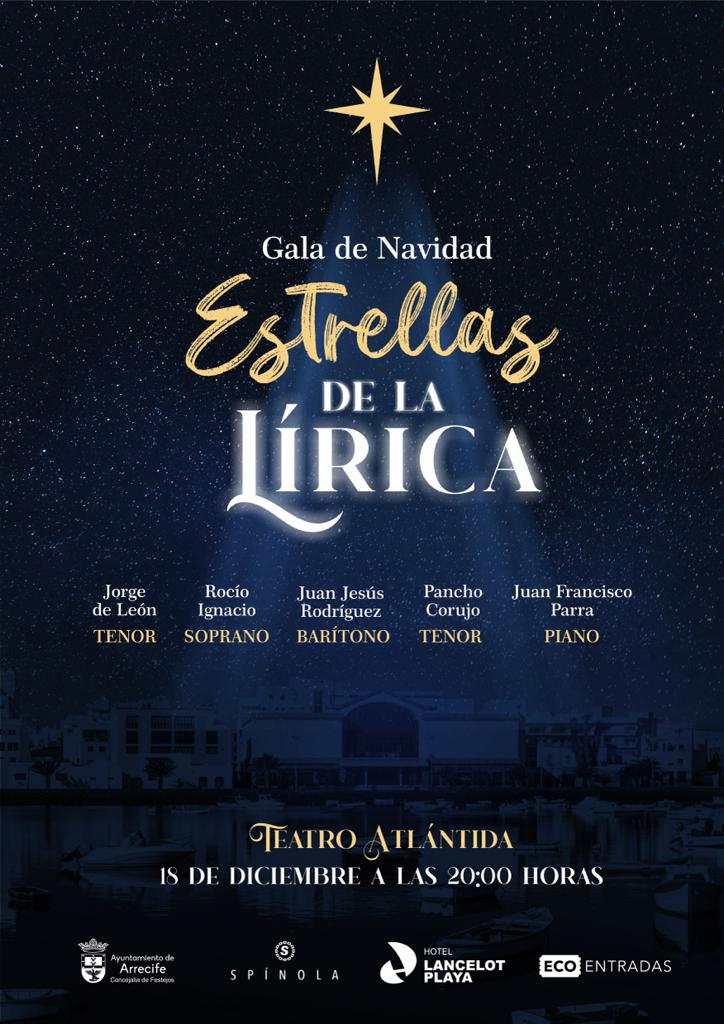 Arrecife, a través de la Concejalía de Festejos, ha organizado la Gala de Navidad "Estrellas de la Lírica". El evento tendrá lugar el próximo día 18 de diciembre a las 20:00 horas en el Teatro Atlántida. En ella participarán cuatro solistas operísticos de prestigio internacional que interpretarán las partituras más famosas de la ópera y la zarzuela. La entrada será gratuita y se podrá reservar a través del portal ecoentradas.com a partir del día 10 de diciembre a las 12 del mediodía.