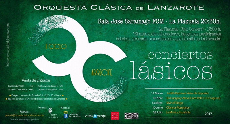 “Paisajes sonoros de España y Europa” es el título de la última cita del II ciclo Conciertos Clásicos de Arrecife, una iniciativa puesta en marcha por la Concejalía de Cultura del Ayuntamiento capitalino y la Orquesta Clásica de Lanzarote, con el patrocinio de la consejería de Turismo, Cultura y Deportes del Gobierno de Canarias y la colaboración de la Fundación César Manrique.