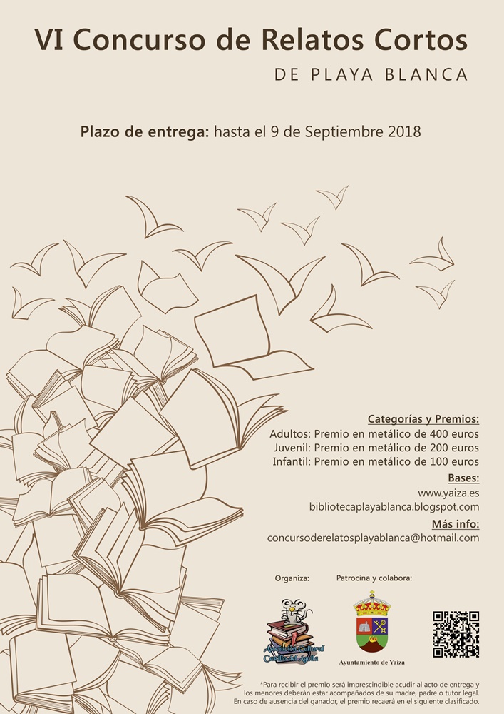 La Asociación Cultural Castillo del Águila y el Ayuntamiento de Yaiza convocan la sexta edición del Concurso de Relatos Cortos de Playa Blanca, con la finalidad de promocionar la literatura creativa entre los residentes lanzaroteños. El certamen repartirá en premios un total de 700 euros en metálico entre los ganadores de las tres categorías, siendo de 400 euros el premio al mejor relato de adultos (mayores de 16 años), 200 euros el de juvenil (ESO) y 100 euros en infantil (2º y 3er ciclo de Primaria).