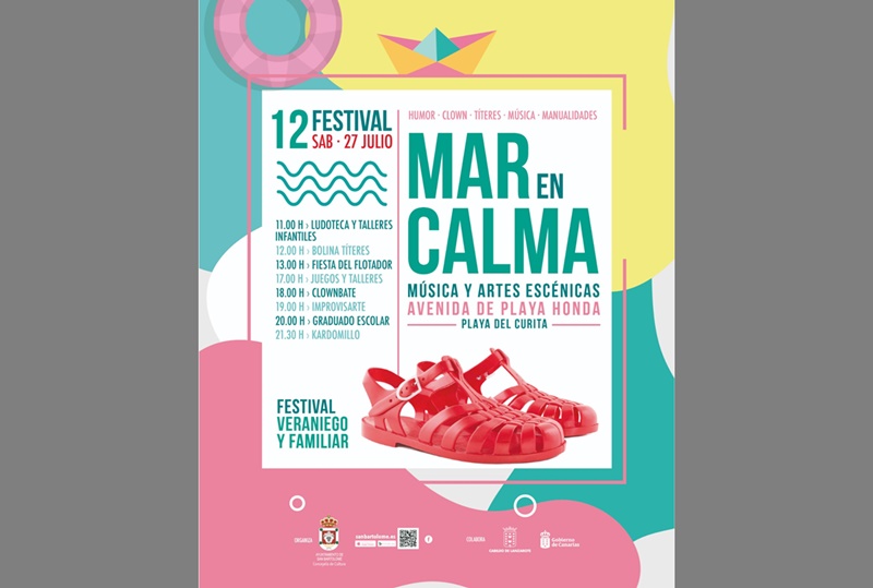 12 Festival Mar en Calma. El sábado 27 de julio tendrá lugar este festival, ya clásico, en la venida de la localidad y en la Playa de El Curita. Las actividades comenzarán a las 11:00 horas con ludoteca y talleres infantiles; a las 12:00 horas, actuación de Bolina Títeres con la obra ‘El Tesoro del Fantasma’. A las 13:00 horas, fiesta del flotador. A las 17:00 horas, juegos y talleres; a las 18:00 horas, el espectáculo de Clownbaret ‘2 Payasos; a las 19.00 horas, ‘Improvisarte; a las 20:00 horas, conciertos de Graduado Escolar y a las 21:30 horas, Kardomillo.