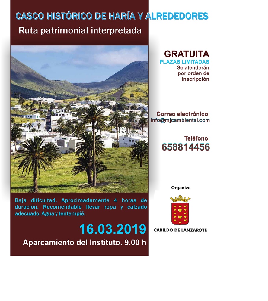 Se llevará a cabo el sábado, 16 de marzo, con salida a las 9:00 horas desde el aparcamiento del Instituto. La duración del sendero por el casco histórico y los alrededores de Haría será de 4 horas, aproximadamente.