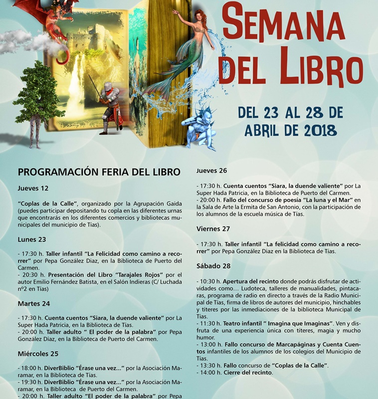 Este lunes, día 23 de abril, arranca la intensa programación cultural del Ayuntamiento de Tías dedicada al libro coincidiendo con el Día del Libro. La Concejalía de Cultura del Ayuntamiento de Tías, bajo la dirección del teniente de alcalde Amado Jesús Vizcaíno, ha programado múltiples actividades de cuenta cuentos, talleres de escrituras, ludotecas y presentaciones de libros donde, además, se une el concurso para buscar la mejor copla, en una iniciativa donde colabora la Agrupación Folclórica Gaida.