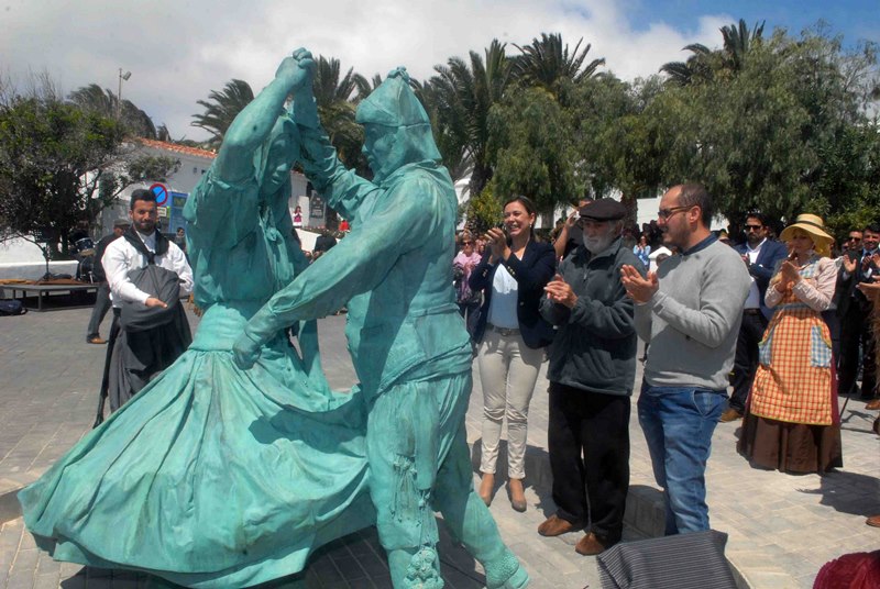 La alcaldesa de San Bartolomé, María Dolores Corujo Berriel, descubrió en la mañana de este domingo, acompañada por el escultor Rigoberto Camacho, la escultura 'La Malagueña' como homenaje al folklore de este pueblo, junto a Lero, Marcial de León, presente en la cita, y que junto a Cesarita Martín y Nievita Perera, llevaron la malagueña por numerosos escenarios.