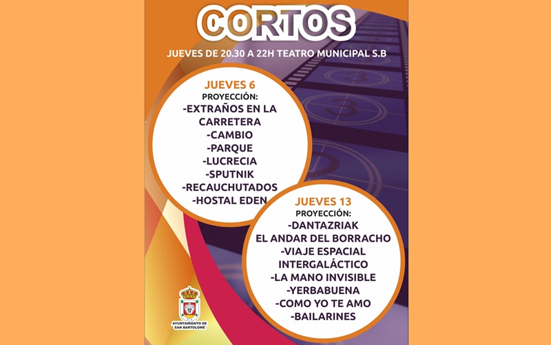 Los mejores cortos se podrán ver en el Festival de Cortos en San Bartolomé que se celebrará los días 6, 13, 20 y 27 de julio en el Teatro Municipal de San Bartolomé a las 20:30 con entrada gratuita. Se trata de una iniciativa promovida por CortoEspaña y el Ayuntamiento de San Bartolomé que pretende acercar el formato corto a la localidad. El domingo 23 de julio, se proyectarán cortos infantiles de 12.00 a 13.30 horas.