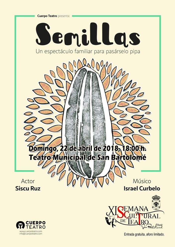 El domingo día 22 de abril a las 18.00 horas, el Teatro de San Bartolomé cierra la XI Semana Cultural de Teatro, con la escenificación de la obra Semillas, para público familiar.