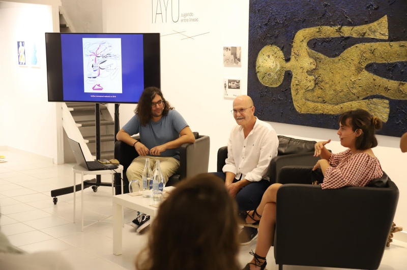 El artista lanzaroteño Tayó, junto a Lana Corujo y David Machado, comisarios de la exposición "Jugando entre líneas", reunieron este martes en El Almacén a más de una veintena de personas interesadas en conocer y adentrarse en los entresijos, los fundamentos y las fases por las que ha transitado este proyecto expositivo, impulsado por el Área de Cultura del Cabildo de Lanzarote, que no sólo aspira a dar a conocer la obra de este creador de Uga, sino también a poner en valor el significado artístico e intelectual de su trabajo.