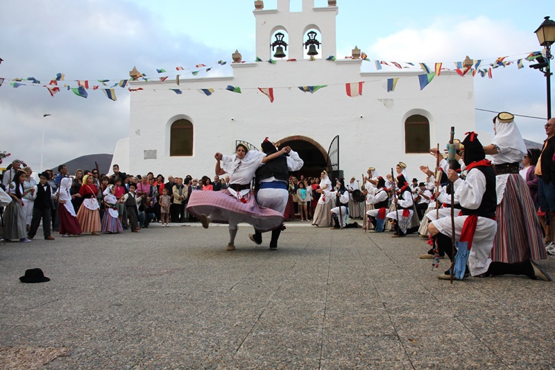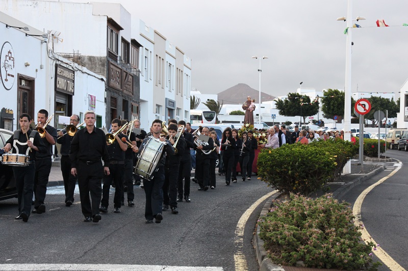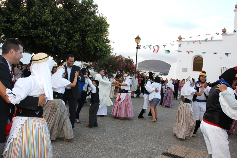 La procesión estuvo acompañada por la Banda Municipal de Tías y las agrupaciones Acuarti y Gaida, que realizaron una exhibición de cantos y bailes en la plaza de la iglesia.