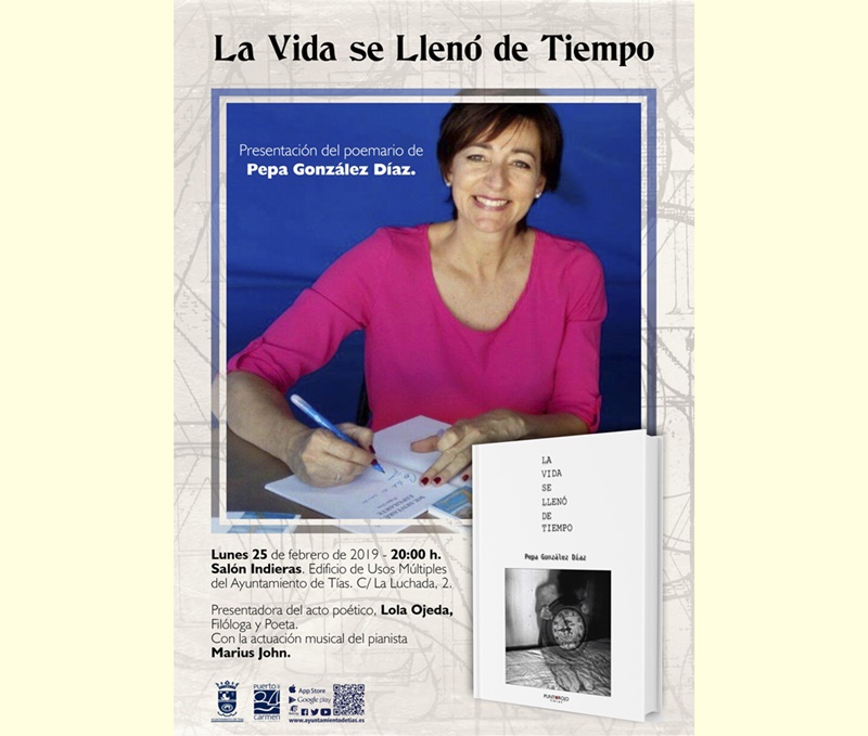 “La vida se llenó de tiempo”. La escritora Pepa González presenta su último trabajo el lunes 25 de febrero, a las 20:00 horas, en el Salón Indieras del edificio de usos múltiples de Tías. Se trata del Poemario “La Vida se Llenó de Tiempo” y estará presentado por Lola Ojeda, filóloga y poeta, y contará con la actuación musical del pianista Marius John.