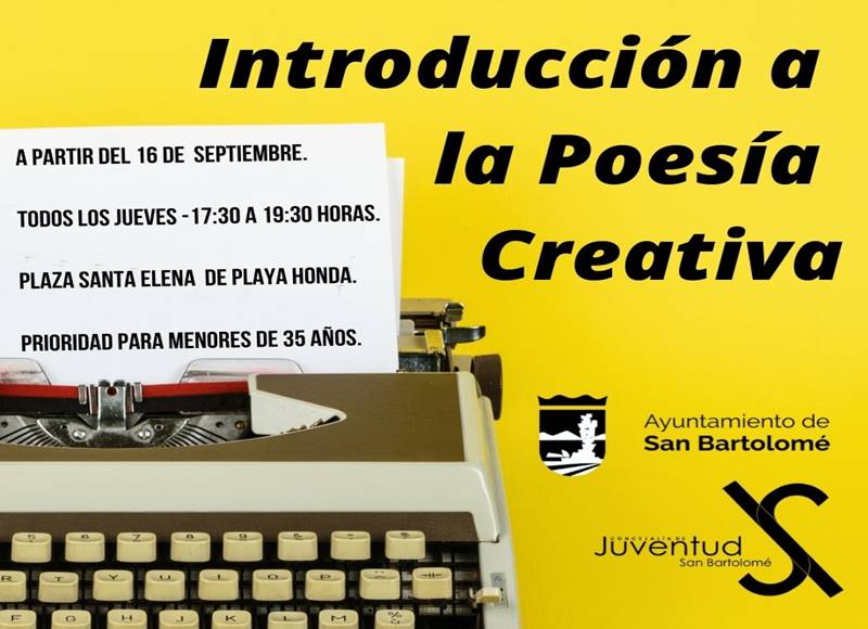 El Ayuntamiento de San Bartolomé, a través de la Concejalía de Juventud, ha abierto el plazo para la inscripción en el curso ‘Introducción a la Poesía Creativa’ que será impartido todos los jueves, durante 12 sesiones a partir del próximo 16 de septiembre.
