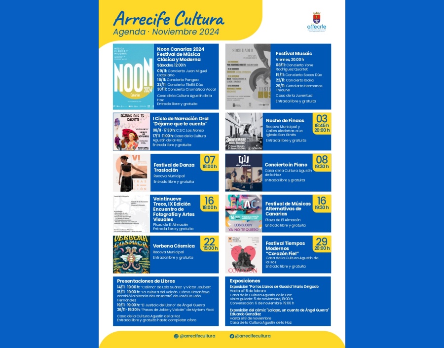 El cartel diseñado por Cultura Arrecife incluye también cuatro presentaciones literarias en la Casa de la Cultura Agustín de la Hoz. Las tres primeras, los días 14, 15 y 19 de noviembre a partir de las 19 horas y en las que se darán a conocer, respectivamente, las obras 'Calima' de Lola Suárez y Víctor Jaubert, 'La cultura del volcán. Cómo Timanfaya cambió la historia de Lanzarote' (José De León Hernández) y 'El Justicia del Llano' (Ángel Guerra). La cuarta, a las 19.30 horas del día 26, a cargo de la periodista y escritora Myriam Ybot, que presentará 'Pasos de Jable y Volcán'.