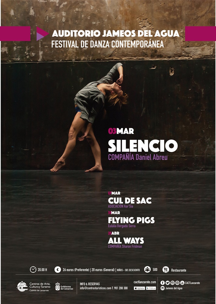 Silencio, de Daniel Abreu; Cul de sac (17 de marzo), de la Asociación Kor'sia; Flying Pigs (31 de marzo), de la Compañía de danza Eulalia Bergada Serra, y All Ways (21 de abril), de la Compañía de danza Sharon Fridman fueron las ganadoras del concurso público convocado por los Centros de Arte, Cultura y Turismo del Cabildo de Lanzarote para incorporar talento, creatividad y originalidad a su programación cultural 2017/18.