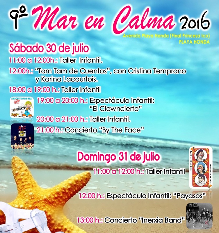Los próximos días 30 y 31 de julio la localidad de Playa Honda, en San Bartolomé, contará por noveno año consecutivo con el Festival Mar en Calma, encuentro musical y teatral que se consolida como el festival estival del municipio cerrando el mes de julio. La apuesta cultural Festival Mar en Calma vuelve así a Playa Honda, con dos días llenos de actos para público familiar, en el que se entremezclan los talleres, cuentos, música, clown, teatro y conciertos.