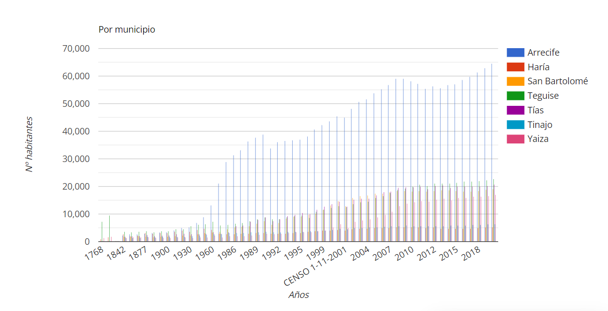 Resulta sencillo acudir al Centro de Datos del Cabildo de Lanzarote para observar cómo en menos de cuatro décadas (38 años para ser exactos), por ejemplo, la población de la isla se ha triplicado y, en detalle, la de la capital se ha duplicado. Es decir, del año 1986 a nuestro tiempo, Arrecife ha pasado de menos de 30.000 habitantes a 62.000 y Lanzarote de 56.000 a más de 155.000.