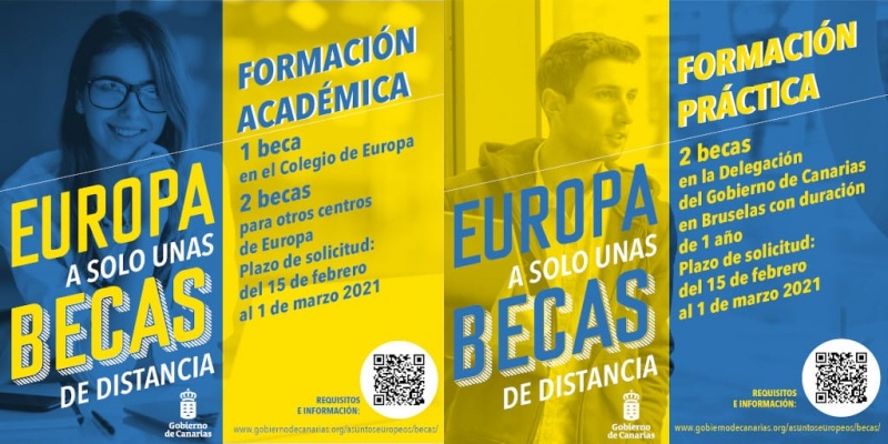 La Consejería de Hacienda, Presupuestos y Asuntos Europeos del Gobierno de Canarias ha convocado cinco becas de formación en asuntos europeos, tres de ellas para cursar estudios de postgrado y dos para la realización de prácticas en la Delegación del Gobierno de Canarias en Bruselas. La cuantía total de las ayudas, cuya convocatoria se publicó el pasado 5 de febrero en el Boletín Oficial de Canarias, es de 100.000 euros.
