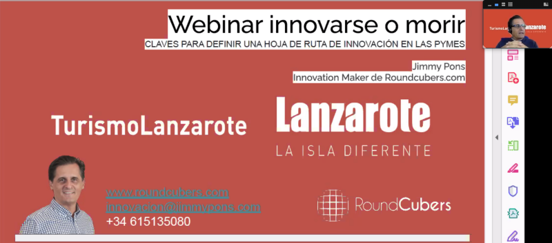 El webinar ''Innovarse o morir, claves para definir una hoja de ruta de innovación'' ofrecido por Jimmy Pons, experto en la aplicación práctica de la innovación turística y cofundador del grupo Round Cubers, ha puesto hoy martes el broche al primer ciclo de formación online organizado por la Sociedad de Promoción Exterior de Lanzarote (SPEL-Turismo Lanzarote).